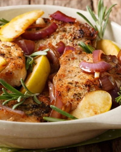 Sült sertéskaraj almával, áfonyával és lila hagymával