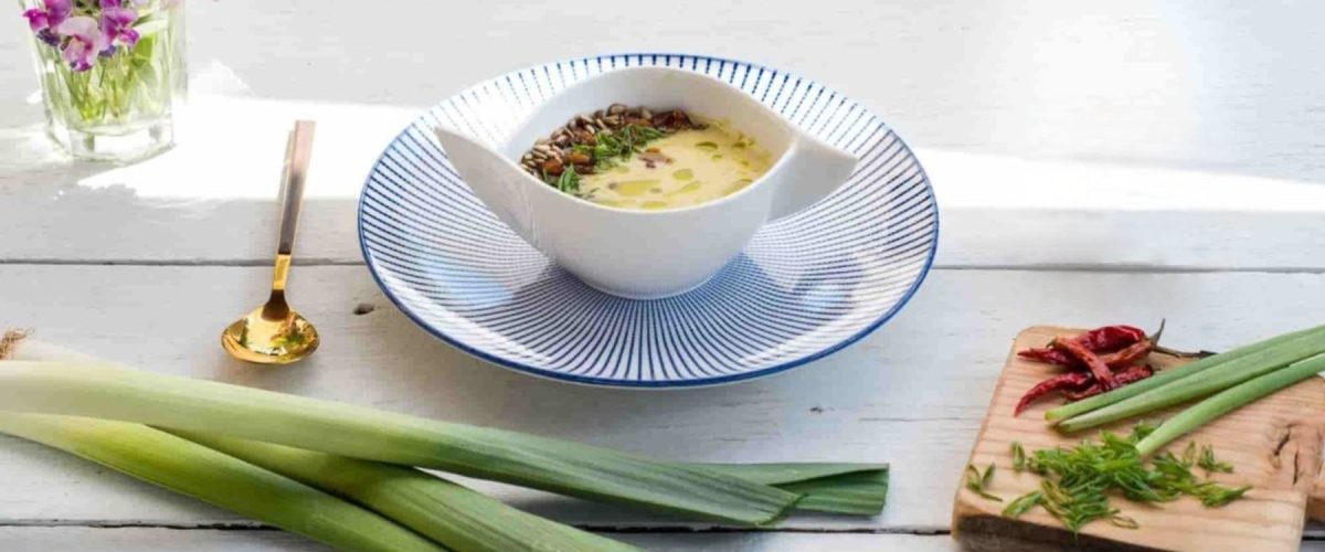 A kész levest tányérokba merjük, a tetején pedig ízlésünk szerint elrendezzük a ropogós szalonnát, a metélőhagymát és a pirított napraforgómagot, illetve rácsorgatunk egy kevés tisztított vajat.