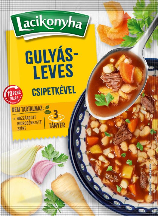 A Gulyásleves csipetkével nem tartalmaz tartósítószert és hozzáadott hidrogénezett zsírt. 3 tányérnyi adag.