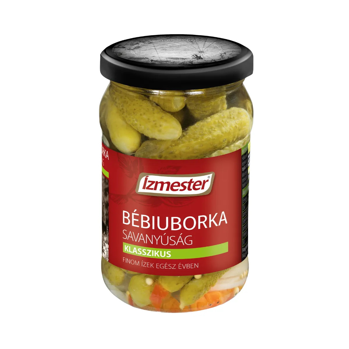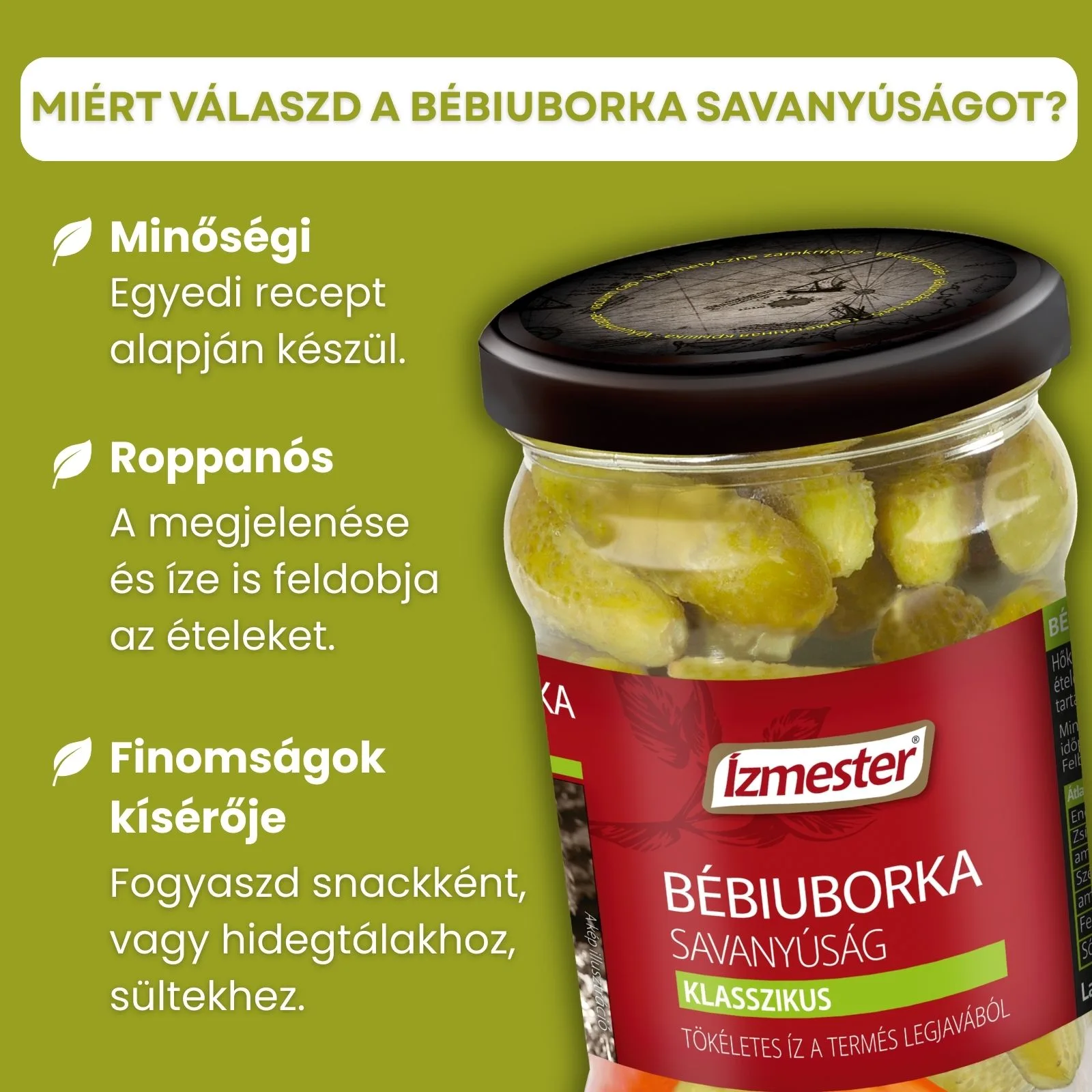 A klasszikus bébiuborka savanyúság a hagyományos ízek kedvelőinek készült. Ropogós, apró uborkák finoman fűszerezett páclében, amelyek tökéletes kiegészítői lehetnek meleg fogásoknak, sülteknek vagy akár egy egyszerű szendvicsnek is. Finom ízvilág, gondosan kiegyensúlyozott savasság és frissítő roppanósság jellemzi, így sokoldalúan használható.