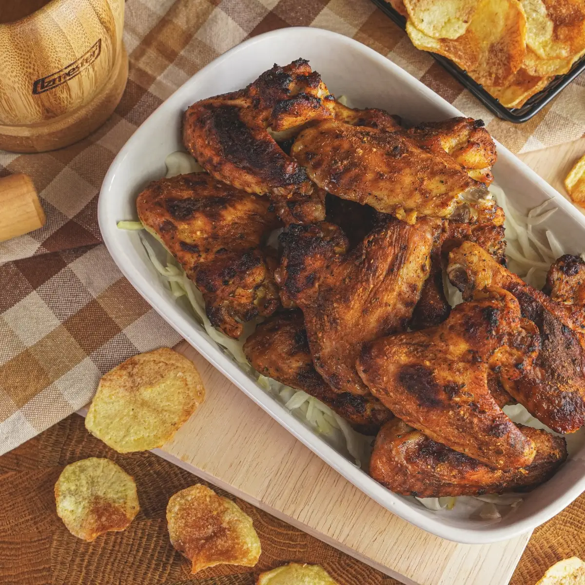 Grillezett csirkeszárnyak fehér tálban