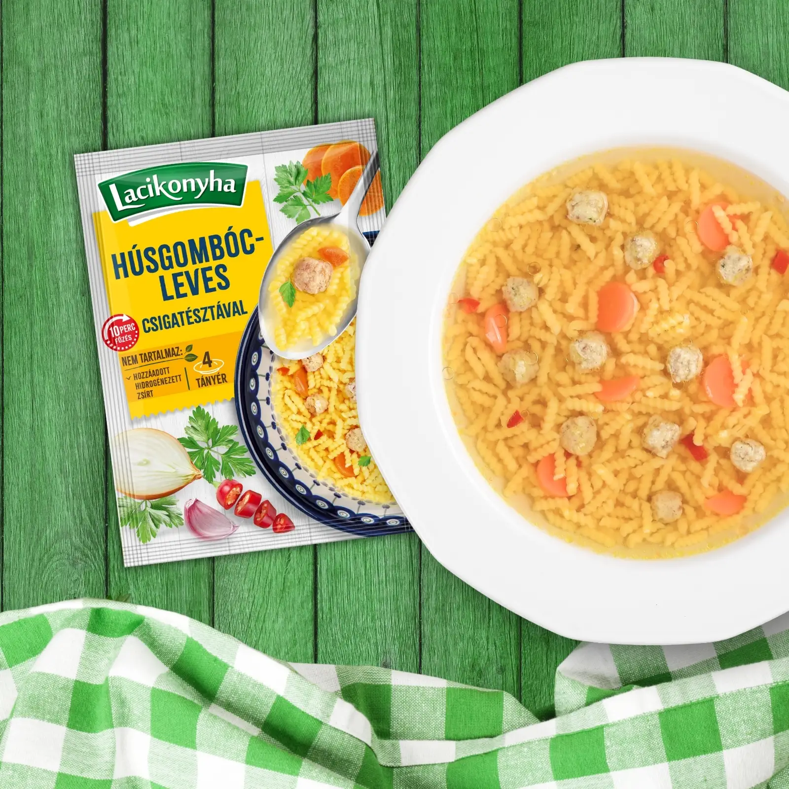 A puhára főzött, illatos marhahúsból készült húsgombócleves méltán az egyik legkedveltebb fogás a klasszikus házias konyhában. A marhahúsból készült gombócok mellett válogatott szárított zöldségekkel és karakteres fűszerekkel gazdagítottuk a levest, enyhén csípős ízvilággal. A Lacikonyha Húsgombócleves csigatésztával tökéletes választás, ha gyorsan szeretnél egy laktató, meleg és otthonos levest az asztalra varázsolni – főként akkor, amikor nincs idő vagy energia főzni, de nem szeretnél lemondani a finom ízekről. A Lacikonyha májgombóclevese nem tartalmaz tartósítószert, és egy csomag 4 tányérnyi adagot biztosít.