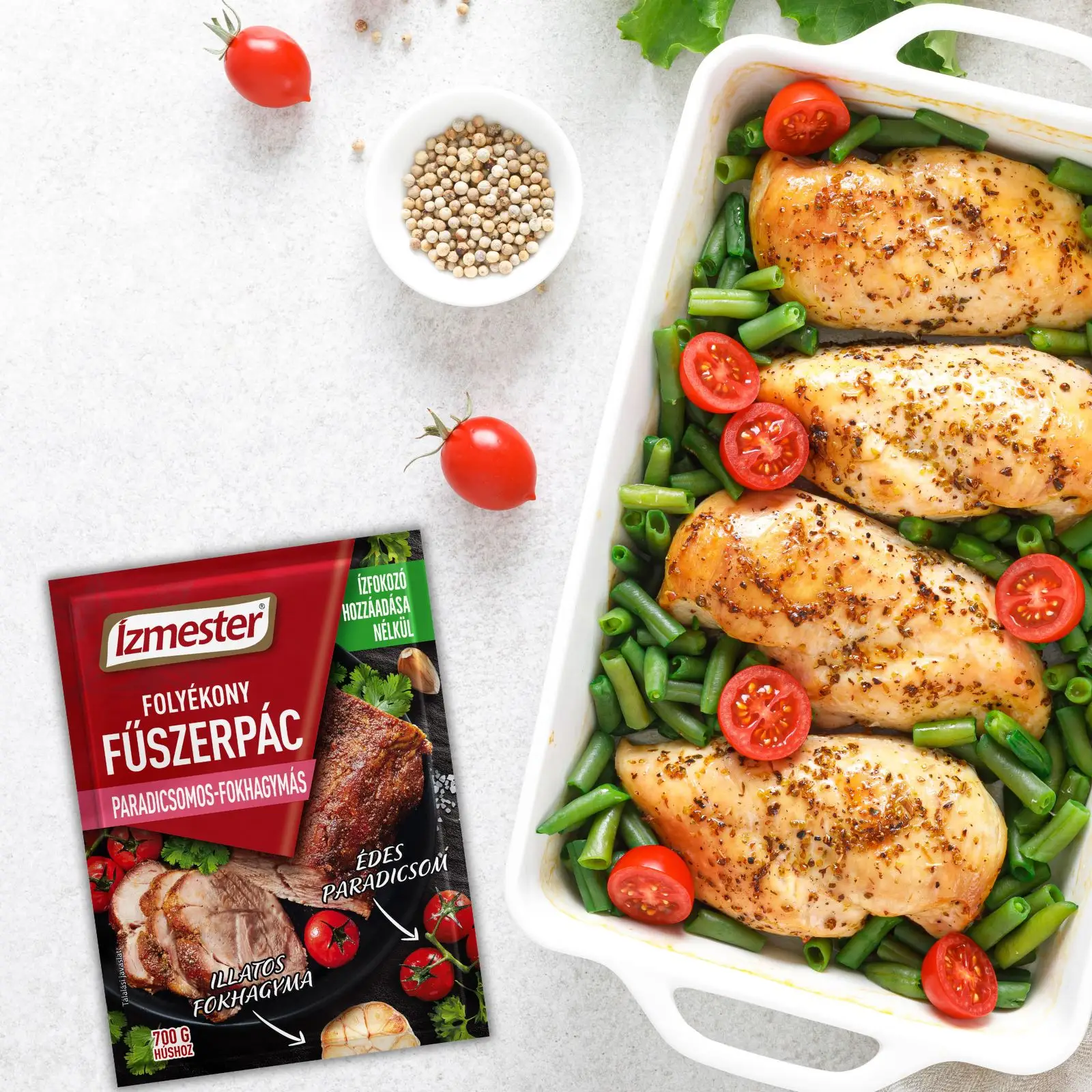 Az Ízmester paradicsomos-fokhagymás folyékony fűszerpác nem csak a nyári grillpartik sztárja! Folyékony állagának és karakteres ízvilágának köszönhetően egész évben bevetheted a konyhában: legyen szó serpenyőben sült gyors vacsoráról, sütőben készült hétvégi fogásról vagy akár egy különleges ünnepi ebédről.