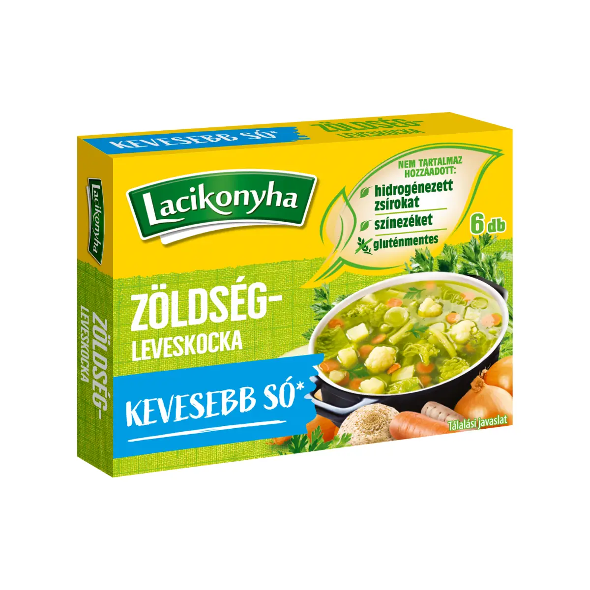 Ha a klasszikus, házias ízeket keresed, a Lacikonyha Zöldségleveskocka kiváló választás. Sárga színével és finom, gazdag ízével igazi otthonos hangulatot varázsol az ételeidbe. A gondosan válogatott, szárított zöldségek – mint a sárgarépa, lestyángyökér, zeller és petrezselyem – gazdag, zöldséges ízvilágot biztosítanak. A zöldségleveskocka nem tartalmaz hozzáadott színezéket, hidrogénezett zsírt, gluténmentes, és csökkentett sótartalommal készül, így széles körben beilleszthető a mindennapi étrendbe.
